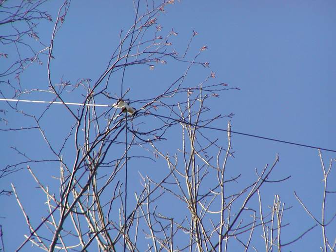 The feedpoint uses PVC a pipe T-section. The coax loops through the T-section to provide strain relief. Wire is tied using a square knot to the T-section and also to rope which is then tied to trees (radials) or which goes over the tops of trees. The “springiness” of the small branches appears to help the wire antennas survive 60 knot winds with little or no damage.