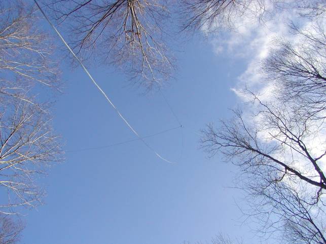 The feedpoints / tiepoints use PVC pipe T-sections. The coax loops through the T-section to provide strain relief. Wire is tied using a square knot to these T-sections and also to rope which is then tied to trees or which goes over the tops of trees. The “springiness” of the small branches appears to help the wire antennas survive 60 knot winds with little or no damage.