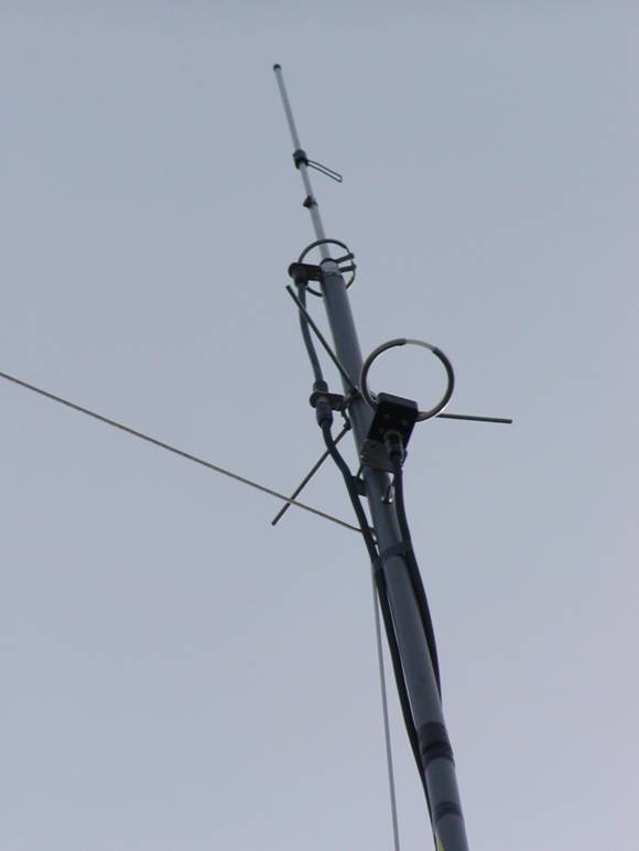 The 440 Mhz ARX450B Ringo Ranger (from Cushcraft) is mounted on top of a 25 foot TV mast which doubles as a support for the 80 meter dipole ladder line.